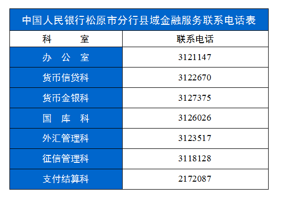 中國人民銀行松原市分行縣域金融服務聯系電話表